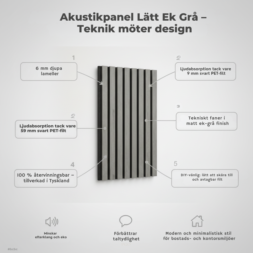 Vår Akustikpanel Trendig Ek Oljad är konstruerad med djupa lameller som fångar upp och sprider ljudvågor, vilket dramatiskt minskar eko i alla rum. Den ekfärgade melaminyta ger inte bara ett varmt och naturligt utseende, utan är också reptålig och enkel att rengöra. Med ett 9 mm lager PET-filt på baksidan absorberar panelerna oönskat ljud samtidigt som de är helt återvinningsbara och värmetåliga upp till 65 °C.