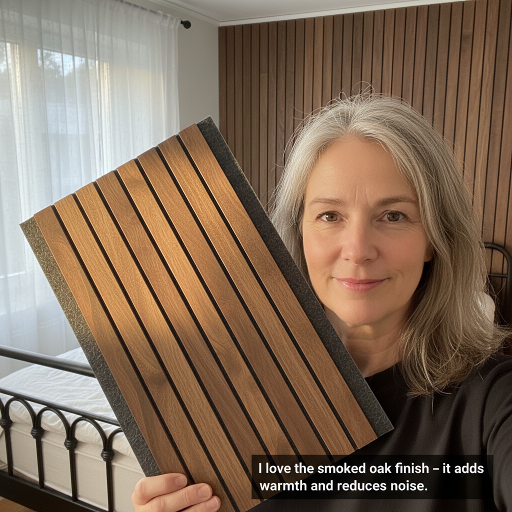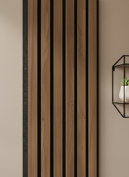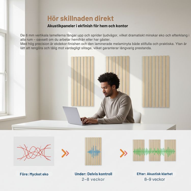 Vår Akustikpanel Trendig Ek Oljad är utvecklad med djupa lameller som fångar upp och sprider ljudvågor, vilket drastiskt minskar ekot i alla rum. Den ekmönstrade melaminyta ger inte bara ett varmt och naturligt utseende, utan är också reptålig och lätt att rengöra. Med ett 9 mm PET-filtlager på baksidan absorberar panelerna oönskat ljud samtidigt som de är helt återvinningsbara och värmetåliga upp till 65 °C.