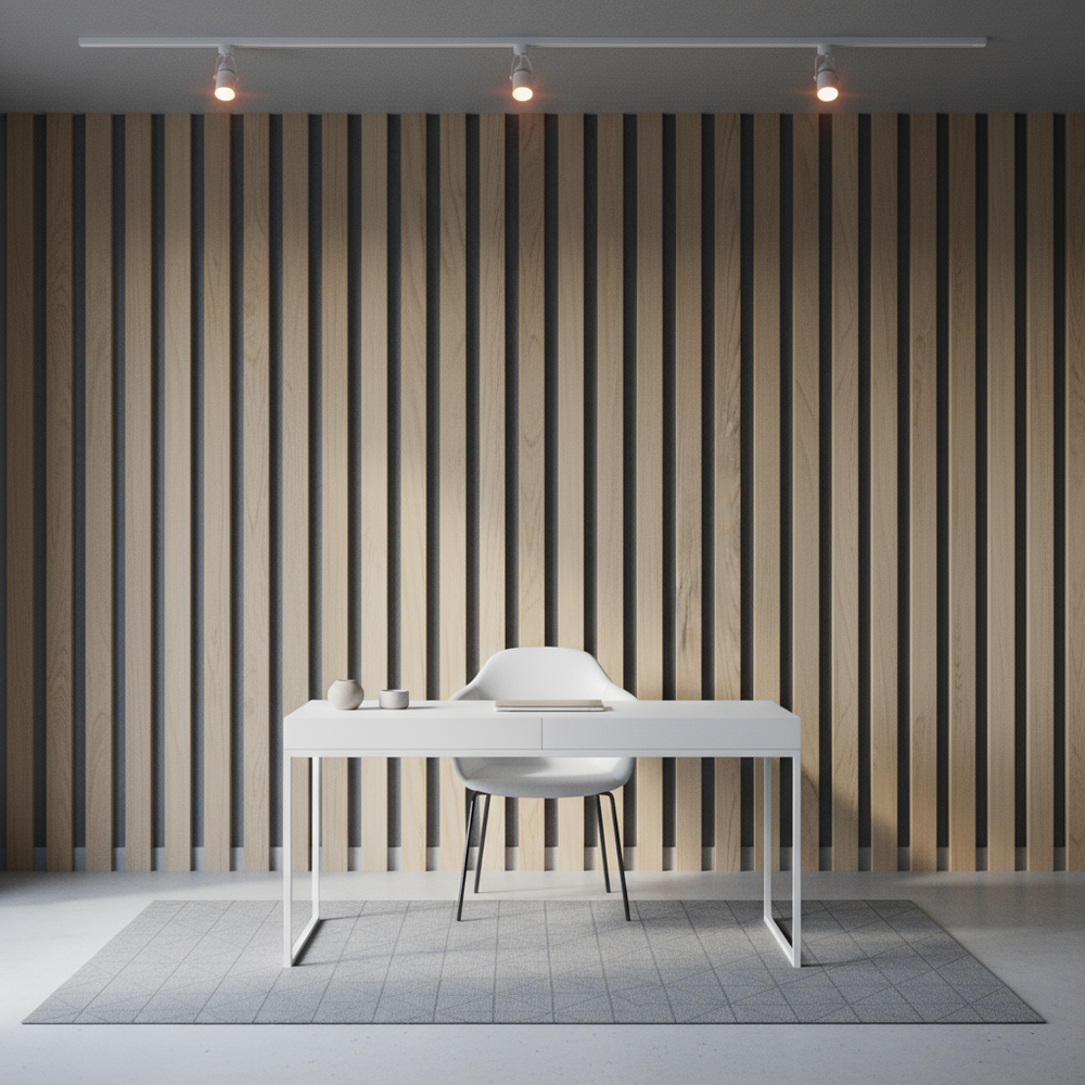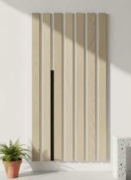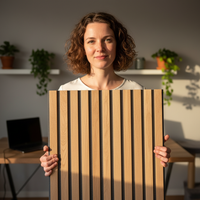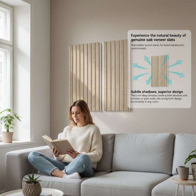 Upplev den naturliga skönheten hos äkta ekfanérslister som sprider ljudvågor och skapar en balanserad akustisk miljö. De 6 mm djupa lamellerna ger subtila skuggor och texturer på dina väggar och lyfter både design och funktionalitet i varje rum.