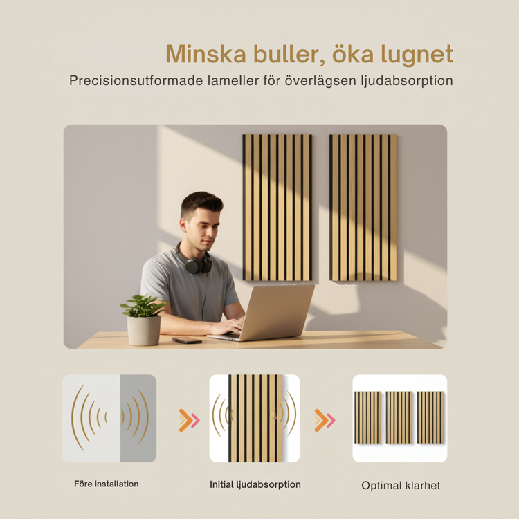 Upplev en tydlig minskning av oönskat ljud tack vare våra precist utformade djupa lameller. Varje spår fångar upp ljudvågor och sprider dem över panelens yta, vilket skapar en mer balanserad akustisk miljö.